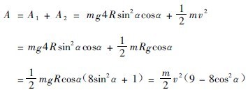 不難證明,此動能即磨機將球由落回點B提升到脫離點A所作的功(A1),和自脫離點用速度v將球拋出所作的功(A2)。因為