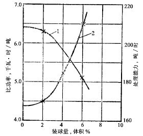 在半自磨中,一般加入占磨機容積2~8%的鋼球,作為強化自磨的措施之一。用于調整礦石自磨介質所補加的鋼球起雙重作用:彌補礦石中粗粒級(大塊礦石)的不足和用以研磨難磨的“臨界顆粒”。有時還從中得到高強度的音響信號,以正確控制給礦量。其結果能大大提高自磨機的生產能力(在個別情況下可以提高3倍),降低了處理每噸合格產品所需的電耗,改善了產品的粒度特性和減少了泥化現象。所加鋼球的直徑應大于100~150毫米,小了則不起什么作用。添加鋼球對自磨機處理能力及比功率消耗的影響試驗結果如圖1所示。隨著磨機中鋼球添加量的增加,磨機的處理能力顯著提高,雖然功率消耗是增加的,但比功率消耗卻明顯下降。