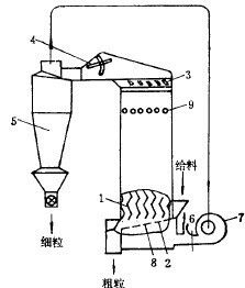 圖2所示的上升氣流風(fēng)力分級(jí)機(jī)(附旋風(fēng)集塵器),呈方形的分級(jí)室內(nèi),裝有若干近于平行的豎直“之”字形導(dǎo)板1。從料斗給到篩板2上的物料,在下部供入的上升氣流作用下,被帶到分級(jí)室中,經(jīng)過彎曲的導(dǎo)板上行過程中,粗的礦粒落下與未過篩的粗粒一起排出,為粗粒產(chǎn)物。細(xì)的礦粒經(jīng)上部通道入旋風(fēng)集塵器分離,得細(xì)粒產(chǎn)物。集塵器上部排出的氣流,又回到風(fēng)機(jī),循環(huán)使用,或者從孔6中排走。