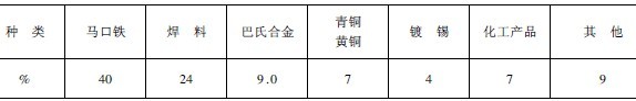 錫為銀白色金屬,元素符號Sn,在元素周期表中屬ⅣA族,原子序50,原子量118.69。錫在13.2~161℃時為b錫(白錫),屬四方品系。13.2℃以下為a錫(灰錫),屬等軸晶系。161℃以上為y錫(脆錫),屬斜方晶系。赤熱時,錫迅速氧化并揮發。錫的化學價為+2和+4。錫的物理常數為:密度,克/厘米3:b錫7.31(20℃),a 錫5.75(13.2℃);熔點231.968℃;沸點2270℃,比熱,b錫221.90(25℃)焦/千克·開,a錫2135.268焦/千克·開。