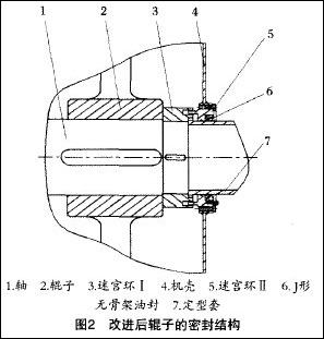 為了解決上述問題,對(duì)該密封結(jié)構(gòu)進(jìn)行改進(jìn),采用迷宮密封及J形無(wú)骨架油封結(jié)構(gòu),其結(jié)構(gòu)見圖2。迷宮環(huán)I通過鍵聯(lián)接安裝在輥?zhàn)虞S上,迷宮環(huán)Ⅱ安裝在機(jī)殼上,這樣迷宮環(huán)I和迷官環(huán)Ⅱ組成了一組迷宮密封。在迷宮環(huán)的外側(cè)還安裝了l副J形無(wú)骨架油封。